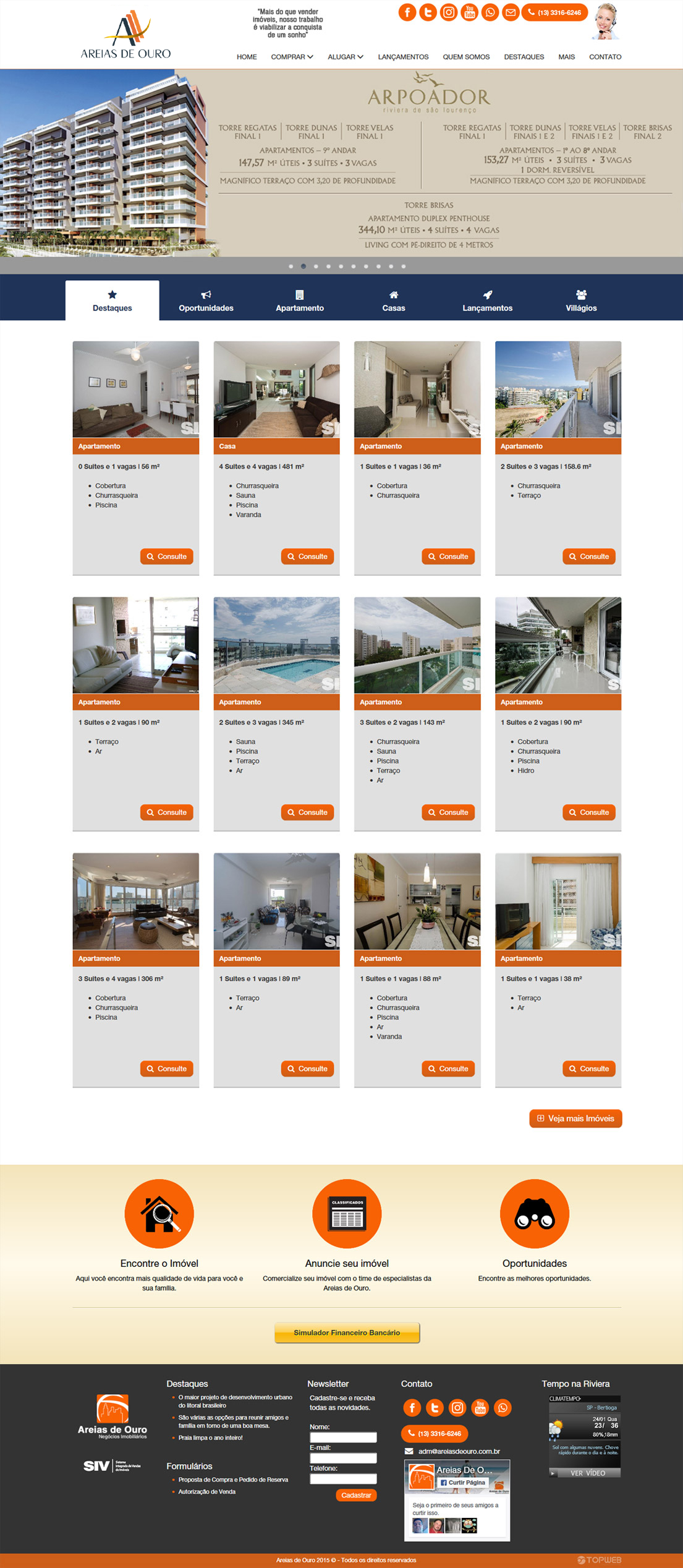 No projeto Areias de Ouro, atuei no desenvolvimento de um site imobiliário focado na apresentação de imóveis residenciais, incluindo casas e apartamentos, com navegação intuitiva e organização clara das informações. A proposta foi criar uma plataforma digital que facilitasse a busca e visualização de imóveis, reunindo fotos, descrições detalhadas e dados relevantes para apoiar a tomada de decisão dos usuários.